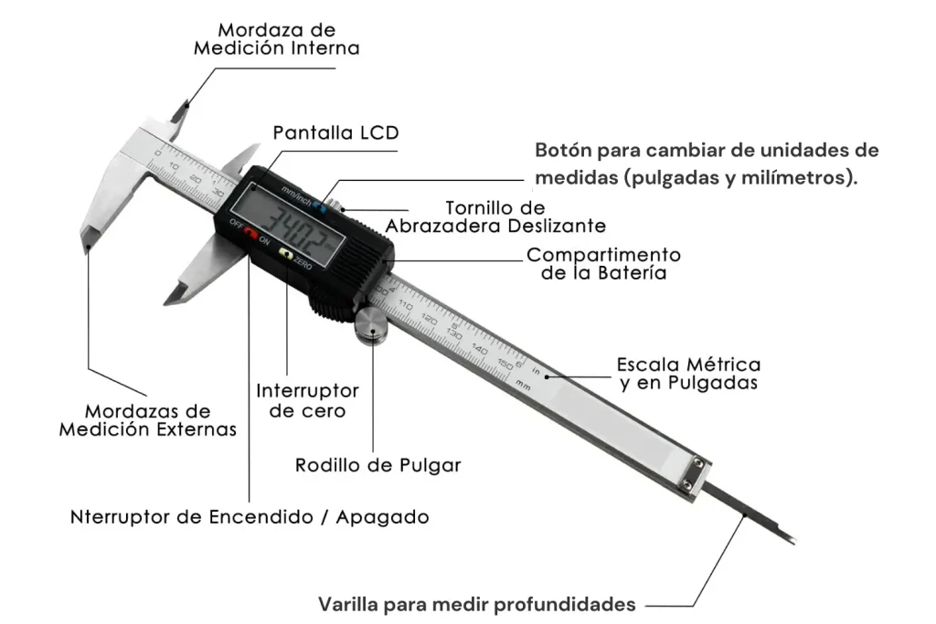 El calibrador digital de consta de varias partes claves que permiten realizar mediciones precisas y de fácil lectura. A continuación, se describen las partes principales: